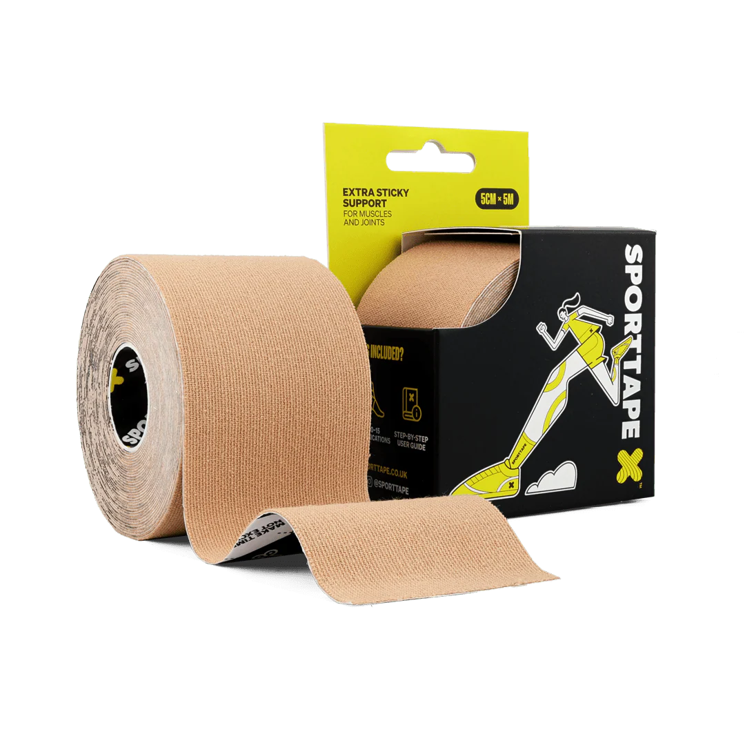 - 1x **SPORTTAPE Beżowy Extra Sticky** – taśma o wymiarach 5 cm x 5 m.